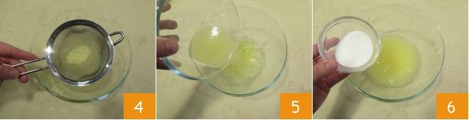 Auf diese Weise filtern Sie den Saft und verhindern, dass Fruchtfleisch- und Samenkernreste in den Zitronensaft gelangen 4, gießen Sie dann den Saft in ein größeres Gefäß, Sie sollten 430 Gramm erhalten, 5 und fügen Sie den Zucker hinzu 6.