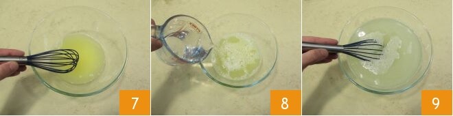 Nachdem Sie gut gerührt haben, damit sich der Zucker auflöst 7, gießen Sie auch das Wasser hinzu 8 und rühren Sie weiter 9.