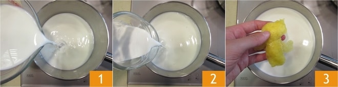 Um die Mousseline-Creme zuzubereiten, geben Sie als erstes die Milch 1 und die Sahne 2 in einen Topf. Fügen Sie die Zitronenschale hinzu 3.
