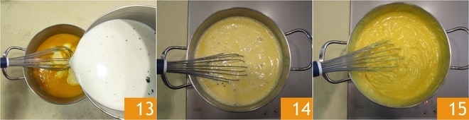Geben Sie die restliche Milch hinzu 13, rühren Sie mit dem Schneebesen. Stellen Sie die Mischung wieder auf den Herd und rühren Sie weiter 14, bis sie sich verdickt hat 15.
