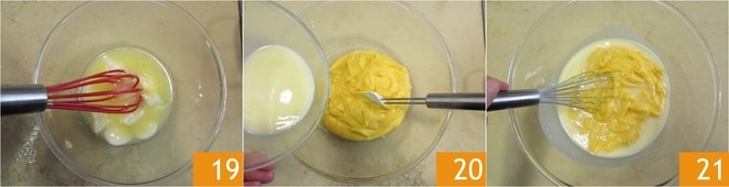Machen Sie dasselbe mit der Butter, indem Sie sie kurz in das Wasserbad tauchen und rühren, bis eine Temperatur von 26 Grad erreicht ist 19. Geben Sie die Butter in die Creme 20 und rühren Sie gut mit einem Schneebesen 21.
