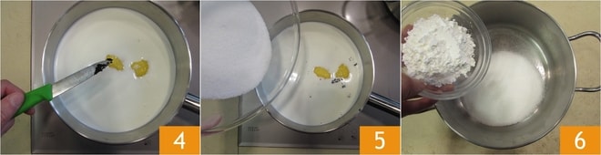 Fügen Sie auch die Samen der Vanilleschote 4 und die Hälfte der Zuckermenge 5 hinzu. Bringen Sie alles bei niedriger Hitze zum Köcheln. In einem anderen Topf geben Sie den restlichen Zucker und die zuvor gesiebte Maisstärke hinzu 6.