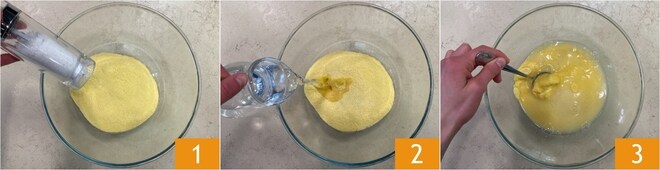 Um die Nachos zuzubereiten, beginnt mit der Zubereitung der Tortillas: Gebt das vorgekochte Maismehl in eine Schüssel zusammen mit dem Salz 1 und dem lauwarmen Wasser 2, dann alles mit einem Löffel verrühren 3.