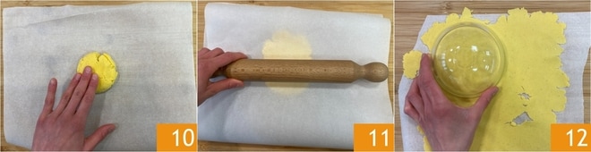 Nach dieser Zeit legt den ersten Teigling auf ein Backpapier und drückt ihn mit den Händen flach 10, dann bedeckt ihn mit einem weiteren Backpapier und rollt ihn mit dem Nudelholz aus, bis eine sehr dünne Teigplatte entsteht 11. Keine Sorge, wenn sie dazu neigt, zu brechen; ihr könnt die Reste wiederverwenden, indem ihr darauf achtet, den Teig während des Wartens abzudecken, damit er nicht austrocknet. Stecht die Teigplatte mit einem Ausstecher oder einer Schüssel mit einem Durchmesser von 12 cm aus 12.