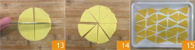 Teilt den ausgerollten Teig zuerst in Viertel 13 und dann in Achtel, um 8 gleich große Dreiecke zu erhalten 14. Legt die Dreiecke auf ein mit Backpapier ausgelegtes Blech 15 und verfahrt ebenso mit den anderen Teiglingen, wobei ihr stets darauf achtet, den ungenutzten Teig abzudecken. Ihr könnt die Dreiecke auf dem Blech stapeln, während ihr sie ausschneidet.