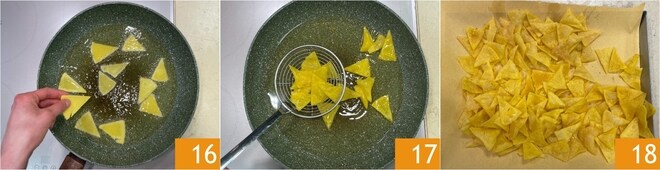 Zur Zubereitung: Erhitzt in einer großen Pfanne einen Finger breit Pflanzenöl auf 180 °C, dann legt wenige Dreiecke gleichzeitig hinein 16. Nach ein paar Minuten wendet sie mit einem Schaumlöffel und frittiert sie weitere 2 Minuten. Lasst die Nachos 17 auf einem Küchenpapier abtropfen und vollständig abkühlen 18. Jetzt können die Nachos pur oder gewürzt genossen werden!