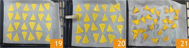 Um die Nachos im Ofen zu backen, legt die Maisdreiecke auf ein mit Backpapier ausgelegtes Blech 19, dann bestreicht sie mit etwas Erdnussöl 20. Backt sie im vorgeheizten Umluftofen bei 190 °C für 13 Minuten, dann nehmt sie heraus und lasst sie abkühlen 21. Eure gebackenen Nachos sind bereit, pur oder gewürzt genossen zu werden!