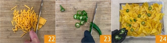 Um die Käse-Nachos zuzubereiten, hackt den Cheddar fein 22 und schneidet die Chili in Ringe 23. Verteilt die Nachos auf einem mit Backpapier ausgelegten Blech und garniert sie mit den Jalapeno-Ringen 24.