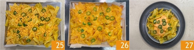 Bestreut die Nachos gleichmäßig mit dem gehackten Cheddar 25. Heißt den Ofen im Grillmodus auf 210 °C vor und backt sie für 5 Minuten oder bis der Käse geschmolzen ist 26. Serviert eure Käse-Nachos noch heiß 27!