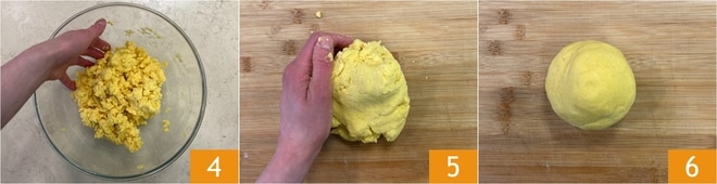 Vermengt die Zutaten in der Schüssel weiter mit den Händen 4, dann übertragt die Mischung auf die Arbeitsfläche und knetet 5, bis eine glatte und homogene Konsistenz erreicht ist 6.