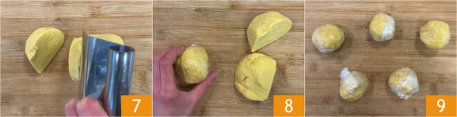 Teilt den Teig in 5 Portionen von je etwa 100 g auf 7, formt jeden Teigling rund 8 und wickelt sie in Frischhaltefolie ein 9. Lasst sie für 5 Minuten bei Raumtemperatur ruhen.