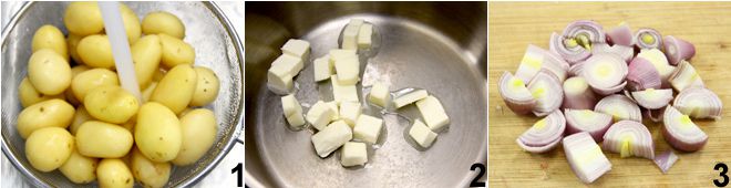 Um die neuen Kartoffeln in Rotwein vorzubereiten, beginnen Sie damit, die neuen Kartoffeln gründlich zu waschen 1, und blanchieren Sie sie einige Minuten in einem Topf mit gesalzenem kochendem Wasser, bis sie innen zart sind, dann gut abtropfen lassen. Schneiden Sie die größeren Kartoffeln in Hälften. In einer großen Pfanne die Butter bei sehr niedriger Hitze schmelzen lassen 2; in der Zwischenzeit die Schalotten grob schneiden 3,