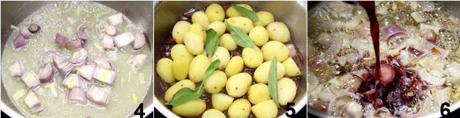 fügen Sie sie in die Pfanne mit der geschmolzenen Butter und braten Sie sie gut an 4, dann mit der Hälfte des Rotweins ablöschen 5 und verdampfen lassen. Fügen Sie dann die Kartoffeln hinzu und lassen Sie sie zusammen mit den Salbeiblättern ebenfalls anbraten 6;