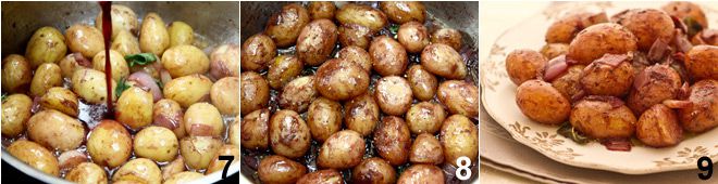 Die neuen Kartoffeln werden ein paar Minuten in kochendem Wasser blanchiert und dann zusammen mit Schalotten geschmort, wobei sie mit Rotwein, Salbei und Pfeffer gewürzt werden; wenige Zutaten für eine hervorragende und schmackhafte Beilage.
