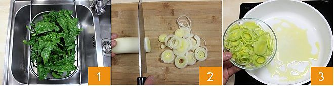Um die Ofenomelett mit Ricotta und Spinat zuzubereiten, beginnen Sie damit, den Spinat gründlich zu waschen 1, dann entfernen Sie die größeren Stängel und lassen Sie ihn abtropfen. Schneiden Sie den Lauch dünn 2, nachdem Sie die äußeren Blätter entfernt und den grünen Teil des Stängels abgeschnitten haben; erhitzen Sie drei Esslöffel Öl in einer Antihaftpfanne und lassen Sie den Lauch goldbraun werden 3;
