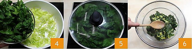 Geben Sie den Spinat in die Pfanne 4, erhöhen Sie die Hitze und lassen Sie ihn einige Minuten mit Deckel kochen 5. Wenn der Spinat weich und gut gekocht ist, lassen Sie ihn abtropfen, drücken Sie ihn in einem Sieb aus 6