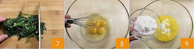 und hacken Sie ihn mit einem Messer 7. Jetzt schlagen Sie die Eier gut mit Salz und Pfeffer nach Belieben 8, fügen Sie die frische Ricotta hinzu 9 und schlagen Sie erneut,