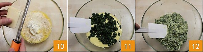 dann fügen Sie den geriebenen Grana, den geriebenen Emmentaler hinzu 10 und schlagen Sie erneut. An diesem Punkt fügen Sie den Spinat zur Eier-Käse-Mischung hinzu 11, mischen Sie alles gut 12.