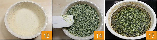 In der Zwischenzeit buttern und bestreuen Sie eine runde Form von etwa 23 cm Durchmesser mit Semmelbröseln 13. Gießen Sie die Mischung in die Form, glätten Sie sie mit einem Spatel 14 und geben Sie sie in den vorgeheizten statischen Ofen bei 180°C und backen Sie sie mindestens 30-40 Minuten (oder im Umluftofen bei 160°C für etwa 25 Minuten); das Omelett ist fertig, wenn es sich gut vom Rand der Form löst und das Innere nicht mehr cremig ist 15. Sie können die Ofenomelett mit Ricotta und Spinat heiß oder lauwarm servieren.