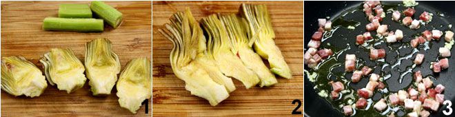 Um das Omelett mit Artischocken, Pilzen und geräuchertem Speck zuzubereiten, beginnen Sie damit, die Artischocken mit dem Verfahren im Video der Kochschule hier klicken zu reinigen; Sie sollten nur die Herzen und Stiele verwenden 1. Reinigen Sie die Pilze und schneiden Sie sie in kleine Stücke. Schneiden Sie die Artischockenherzen in dünne Scheiben 2 und die Stiele in kleine Stücke und bewahren Sie sie in angesäuertem Wasser auf, um ein Anlaufen zu verhindern. Erhitzen Sie dann das Öl in einer antihaftbeschichteten Pfanne und fügen Sie den gehackten Knoblauch hinzu, braten Sie den Knoblauch an und geben Sie die gewürfelte Speck dazu 3,