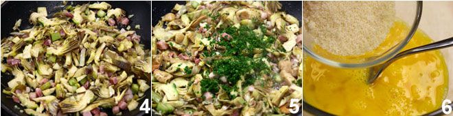 die abgespülten und abgetropften Artischocken und die in Stücke geschnittenen Pilze 4. Lassen Sie alles anbraten, um Geschmack zu verleihen, fügen Sie die gehackte Petersilie hinzu 5 und würzen Sie mit Salz und Pfeffer. Lassen Sie es 10 Minuten kochen. In der Zwischenzeit schlagen Sie in einer Schüssel die 6 Eier mit einer Gabel, fügen Sie den geriebenen Grana Padano 6 und die Milch hinzu und mischen Sie, um die Zutaten zu kombinieren.