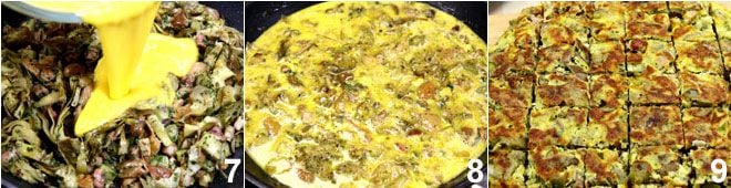 Wenn das Gemüse gar ist, gießen Sie die Mischung in die Pfanne 7, mischen Sie sofort, um die Eier und das Gemüse zu verbinden 8 und lassen Sie das Omelett fest werden. Wenden Sie es, wenn der Boden gar ist, mit Hilfe eines Deckels und lassen Sie es auch auf der anderen Seite kochen. Wir haben uns entschieden, das Omelett mit Artischocken, Pilzen und geräuchertem Speck als Vorspeise zu servieren, indem wir es in Quadrate schneiden 9.