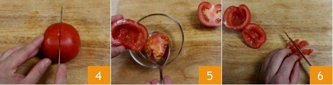 Wenden Sie sich dann der Zubereitung der Tomaten zu. Waschen Sie sie unter fließendem Wasser, schneiden Sie dann eine in Würfel: Entfernen Sie den Stiel und schneiden Sie sie in zwei Hälften 4, dann höhlen Sie das Innere mit einem Löffel aus, um die Kerne zu entfernen 5. Dann schneiden Sie das Fruchtfleisch in Würfel 6 und bewahren Sie sie in einer kleinen Schüssel auf.