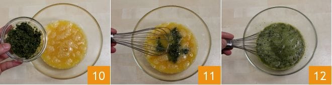 Nachdem Sie die Eier einige Sekunden geschlagen haben, fügen Sie das Pesto hinzu, das Sie beiseitegelegt hatten 10 und mischen Sie mit dem Schneebesen 11, um eine homogene Masse zu erhalten 12.