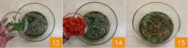 Dann fügen Sie auch die zerkleinerten Basilikumblätter 13 und das gewürfelte Tomatenfruchtfleisch hinzu, das Sie beiseitegelegt hatten 14. Mischen Sie dann alles erneut 15.