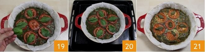 Dekorieren Sie das Omelett mit den ganzen Basilikumblättern 19, indem Sie sie auf jede Tomatenscheibe legen, um einen Farbkontrast zu schaffen. Dann backen Sie das Omelett 20 im vorgeheizten statischen Ofen bei 180°C für 30-35 Minuten oder im Umluftofen bei 160°C für etwa 25 Minuten, bis die Oberfläche golden ist (Sie können das Omelett auch in einer Antihaftpfanne wie ein normales Omelett backen). Nehmen Sie das Omelett mit Pesto und Tomaten heraus 21, lassen Sie es abkühlen und servieren Sie es warm oder kalt nach Ihrem Geschmack!