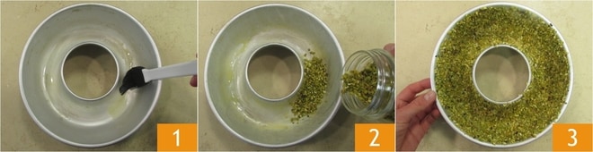 Um den Orangenkuchen zuzubereiten, fetten Sie zuerst die Gugelhupfform ein 1 und streuen Sie das Pistaziengranulat hinein 2, so dass es die Form vollständig bedeckt 3. Stellen Sie es beiseite und bereiten Sie den Teig vor.