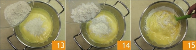 Heben Sie nun das Mehl 13 und die Maisstärke 14 vorsichtig mit einem Teigschaber 15 unter.