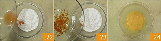 In der Zwischenzeit bereiten Sie die Glasur vor: Geben Sie den Puderzucker und den Orangensaft in eine kleine Schüssel 22, fügen Sie dann die abgeriebene Orangenschale hinzu 23 und rühren Sie mit einem Schneebesen, bis eine glatte und homogene Mischung entsteht 24.