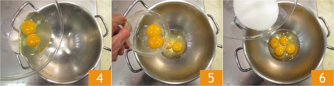 Geben Sie die ganzen Eier 4, die Eigelbe 5 und den Zucker 6 in eine Schüssel im Wasserbad.