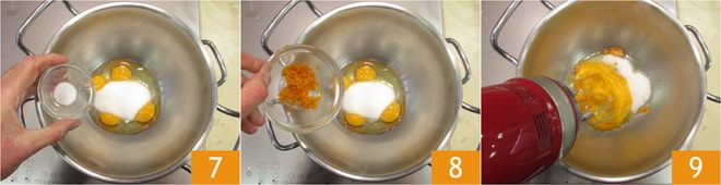 Fügen Sie das Salz 7 und die abgeriebene Orangenschale 8 hinzu. Rühren Sie mit einem Schneebesen, während Sie die Mischung auf eine Temperatur von 45°C bringen 9.