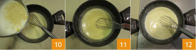 Sobald die Milch zu kochen beginnt, gießen Sie etwas davon in die Eigelbmischung 10, um sie zu temperieren. Dann rühren Sie 11 und fügen die restliche Milch hinzu. Bringen Sie die Creme auf den Herd 12 und kochen Sie sie etwa 5 Minuten,