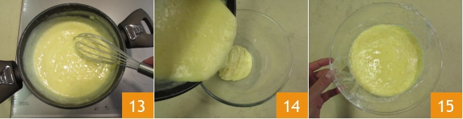 während Sie mit einem Schneebesen rühren, bis sie glatt und dick wird 13. Geben Sie die Creme in eine Schüssel 14, bedecken Sie sie mit Frischhaltefolie 15 und lassen Sie sie zuerst bei Raumtemperatur und dann im Kühlschrank abkühlen.