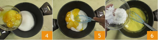 Inzwischen geben Sie in einem anderen Topf Eigelbe und Zucker 4. Vermischen Sie alles gut mit einem Spatel 5, dann fügen Sie die Stärke hinzu 6