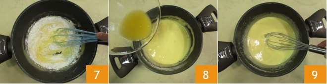 und rühren Sie erneut 7. Fügen Sie dann auch den Orangensaft hinzu 8 und rühren Sie erneut, bis Sie eine glatte, klumpenfreie Mischung erhalten 9.