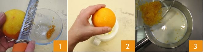Um die Orangencreme zuzubereiten, reiben Sie zuerst die Schale ab 1, pressen Sie die Orange aus 2 und entnehmen Sie die richtige Menge Saft. Geben Sie die Milch in einen kleinen Topf, fügen Sie die Orangenschale hinzu 3 und bringen Sie sie bei niedriger Hitze zum Kochen.