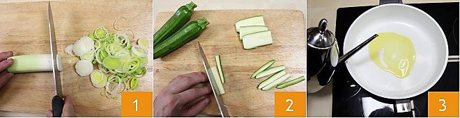 und geben Sie den Lauch dazu 4 und lassen Sie ihn unter Zugabe einer Kelle Gemüsebrühe weitergaren 5. In einem anderen kleineren Topf geben Sie einen Esslöffel Olivenöl und fügen die Erbsen hinzu 6,