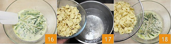 und vermengen alles gut 16. Dann kochen Sie die Orecchiette in reichlich gesalzenem Wasser 17, sobald die Pasta gekocht ist, geben Sie sie in die Schüssel 18 zusammen mit der Joghurtcreme und dem Gemüse,