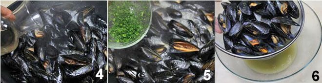 Wenn Sie sehen, dass sie sich zu öffnen beginnen, löschen Sie mit dem Weißwein ab 4 und fügen Sie die Hälfte der insgesamt gehackten Petersilie hinzu 5. Sobald alle Miesmuscheln geöffnet sind, lassen Sie sie gut abtropfen und sammeln Sie das Kochwasser in einer Schüssel, da es am Ende zum Würzen der Pasta verwendet wird 6.