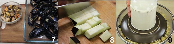 Nun schälen Sie die Hälfte der Miesmuscheln und behalten die andere Hälfte ganz für die endgültige Dekoration des Gerichts 7. Schneiden Sie die Enden der Auberginen ab, würfeln Sie sie 8 und legen Sie sie in einem Sieb oder Durchschlag in Schichten, bestreuen Sie sie mit grobem Salz. Decken Sie sie mit einem Gewicht ab, damit der Druck hilft, das Wasser und die Bitterkeit zu entfernen, und lassen Sie sie so mindestens eine Stunde ruhen 9.