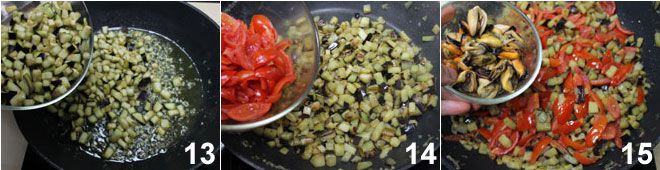dann fügen Sie die Auberginen 13 und die Kirschtomaten 14 hinzu, salzen Sie, um das Gemüse zu würzen, und lassen Sie es 10 Minuten kochen. Wenn sie gar sind, fügen Sie die Miesmuscheln hinzu 15,