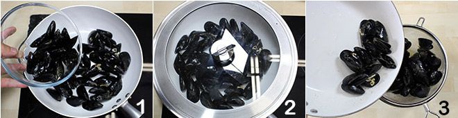 Um die Alghero-Paella zuzubereiten, waschen und säubern Sie die Miesmuscheln gründlich (Sie können dem Verfahren folgen, das in der Kochanleitung „Wie man Miesmuscheln reinigt und öffnet“ beschrieben ist), dann geben Sie sie in einen Topf 1, decken ihn mit einem Deckel ab und lassen die Muscheln bei starker Hitze für ein paar Minuten aufgehen 2. Sobald sich alle Miesmuscheln geöffnet haben, filtern Sie den Kochsud und stellen ihn beiseite 3.