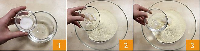 Beginnen Sie mit der Zubereitung des Panada-Teigs: Lösen Sie das Salz im lauwarmen Wasser auf 1, fügen Sie das Schmalz 2 (oder die gleiche Menge Olivenöl extra vergine) dem Grießmehl hinzu, beginnen Sie zu kneten, indem Sie das lauwarme Wasser nach und nach hinzufügen 3.