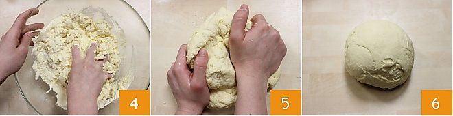 Kneten Sie kräftig von Hand 4, bis alle Zutaten zusammenkommen (oder verwenden Sie eine Küchenmaschine mit Knethaken), dann geben Sie den Teig auf ein Nudelbrett und arbeiten ihn kräftig durch, indem Sie den Teig mit den Händen ziehen 5, bis keine "Falten" mehr vorhanden sind. Sie müssen einen recht festen und glatten Teig erhalten, das dauert etwa 15 Minuten. Am Ende muss er gut kompakt, aber nicht zu trocken sein, sonst können Sie ihn nicht ausrollen und bearbeiten 6.