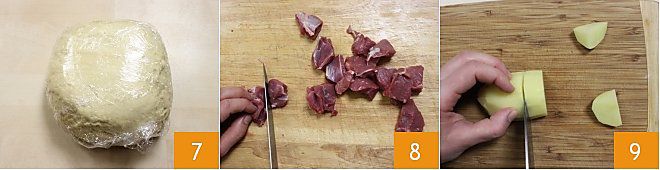 Decken Sie ihn gut mit Frischhaltefolie ab 7 und lassen Sie ihn etwa eine halbe Stunde an einem kühlen Ort ruhen (aber nicht im Kühlschrank). In der Zwischenzeit schneiden Sie das Lammfleisch in kleine Stücke 8, schälen Sie die Kartoffeln und schneiden Sie sie in nicht zu kleine Würfel 9.