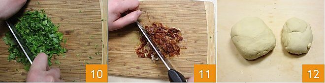Hacken Sie den Knoblauch, die Petersilie 10 und die getrockneten Tomaten 11. Nehmen Sie den Teigkloß und teilen Sie ihn in zwei Teile 12, das Verhältnis sollte etwa 1/3 für die Abdeckung (den Deckel) und 2/3 für den Boden sein, der die Füllung aufnehmen wird.